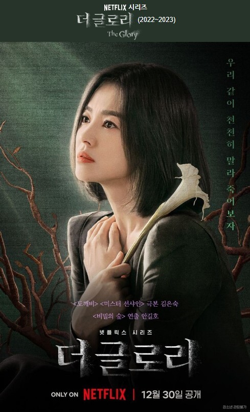 연출을 맡은 안길호는 SBS프로듀서로 활동하다가 2016년 퇴사하고 현재는 tvN작품을 많이 연출하는데 <옥탑방 왕세자> <원더풀 마마> <사랑만 할래> <비밀의 숲> <알람브라 궁전의 추억> <WATCHER> <청춘기록> 등의 작품이 있다. 더 글로리의 작가는 <태양의 남쪽>으로 데뷔하여 <파리의 연인> <시크릿 가든> <신사의 품격> <도깨비> <태양의 후예> <미스터 선샤인> 등으로 잘 알려진 김은숙 작가이다. 김은숙 작가는 강원도 시골의 가난한 집에서 3남매 중 장녀로 태어나 고등학교 졸업 후, 고향의 작은 가구회사 경리로 일하며 작가의 꿈을 품게 되고 27살의 나이에 서울예술전문대학 문예창작과에 입학하였다고 한다. 위에 나열한 작품들만 봐도 김은숙 작가의 드라마는 시청률의 성과는 의심할 여지없는 듯하나 돈 많고 능력 있는 까칠한 남자 주인공과 가난하지만 억척스럽게 사는 자존심 센 여자주인공이 만나 새로운 인생을 사는 뻔한 스토리는 호불호가 갈리기도 하지만 도깨비, 태양의 후예, 미스터 선샤인 등의 작품으로 그동안 약점으로 이야기했던 한계에 대해서도 많이 벗어나 멋진 작품들을 만들어냈다. 평가가 어쨌든 너무 재미있게 본 드라마가 많았고 송헤교 배우와 '태양의 후예' 이후 6년 만에 재회하여 공개되는 김은숙 작가의 작품은 더욱 기대하게 된다.