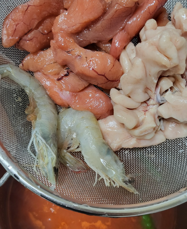 물이 끓기 시작하면 해물과 야채, 양념 소스를