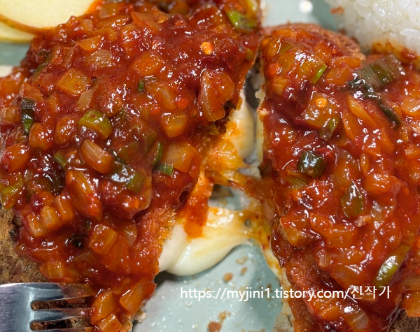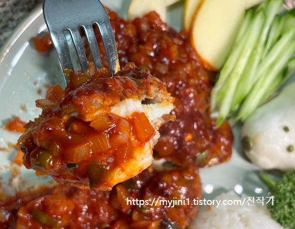 입에 넣어주었는데 돈까스가 매콤한 소스에