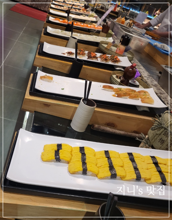 광어초밥, 새우초밥, 연어초밥, 여러가지 롤 등