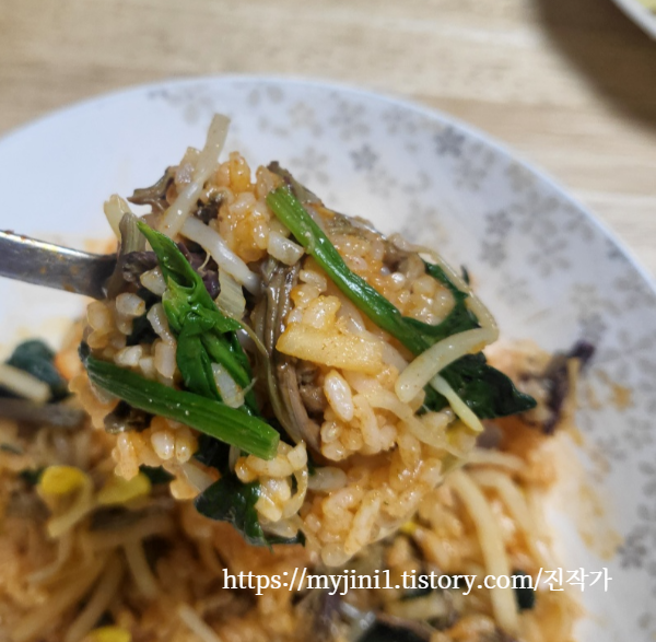 골고루 비빈 후, 한 숟가락 가득 떠먹으면