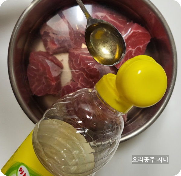 물에 한두 번 헹군 뒤 고기가 잠길 정도로