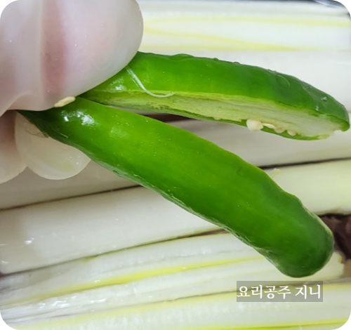 고추도 반으로 갈라 넣어주세요.