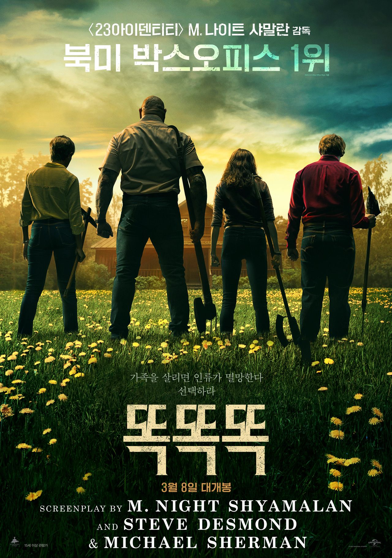 영화 이야기를 하려면 M. 나이트 샤말란 감독의 이야기를 빼놓을 수없겠다. 1970년 인도에서 출생했으나 6개월 뒤 펜실베이니아로 건너와 미국 국적을 취득했다. 의사집안에서 태어나 의학을 공부하다 뉴욕 대학교 예술대학에 입학하여 1992년 졸업했다. NYU 재학 중 촬영한 '분노를 위한 기도(Praying with anger)를 시작으로 1999년 적은 예산으로 제작한 <브루스 윌리스> 주연의 <식스센스>가 대흥행을 기록하면서 현재까지도 손꼽히는 최고의 반전영화로 회고되고 있다. 나 또한 <식스센스>를 봤을 때 마지막 '입김 장면'의 반전으로 얼마나 충격적이었는지 오랜 시간이 지난 지금도 기억이 생생하다. 그 이후 몇 번의 대실패도 있었지만 <싸인> <언브레이커블> <23 아이덴티티> <올드>를 만들어 내며 호평을 받았고 다시 주목받는 감독으로 자리에선다.샤말란감독의 영화는 주로 정신적으로나 육체적으로 깊은 상처를 안고 살아가는 결핍이 있는 사람들의 이야기에 초자연적 현상을 주제로 다루며 예상치 못했던 반전으로 이야기를 풀어나간다. 이번영화<똑똑똑>에서도 샤말란 감독의 이야기는 계속된다. 상처를 안고 살아가는 사람들에게 '종말론'이라는 초자연적 현상을 숙제로 들고 와서 어떻게 문제를 풀어가는지와 어떠한 반전의 키워드를 사용할지 기대가 된다.